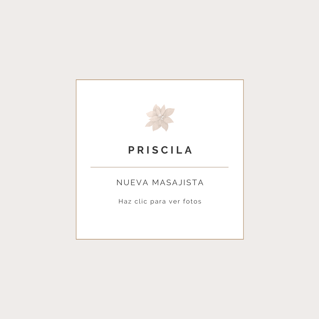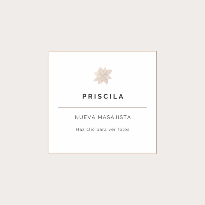 Simpática, cercana y afable, tiene una chispa innata que conquista sin esfuerzo. Aunque es nueva en el mundo de los masajes, su entrega, implicación y saber estar la convierten en una joya en crecimiento. Priscila promete hacerte vivir momentos tan naturales como irresistibles.